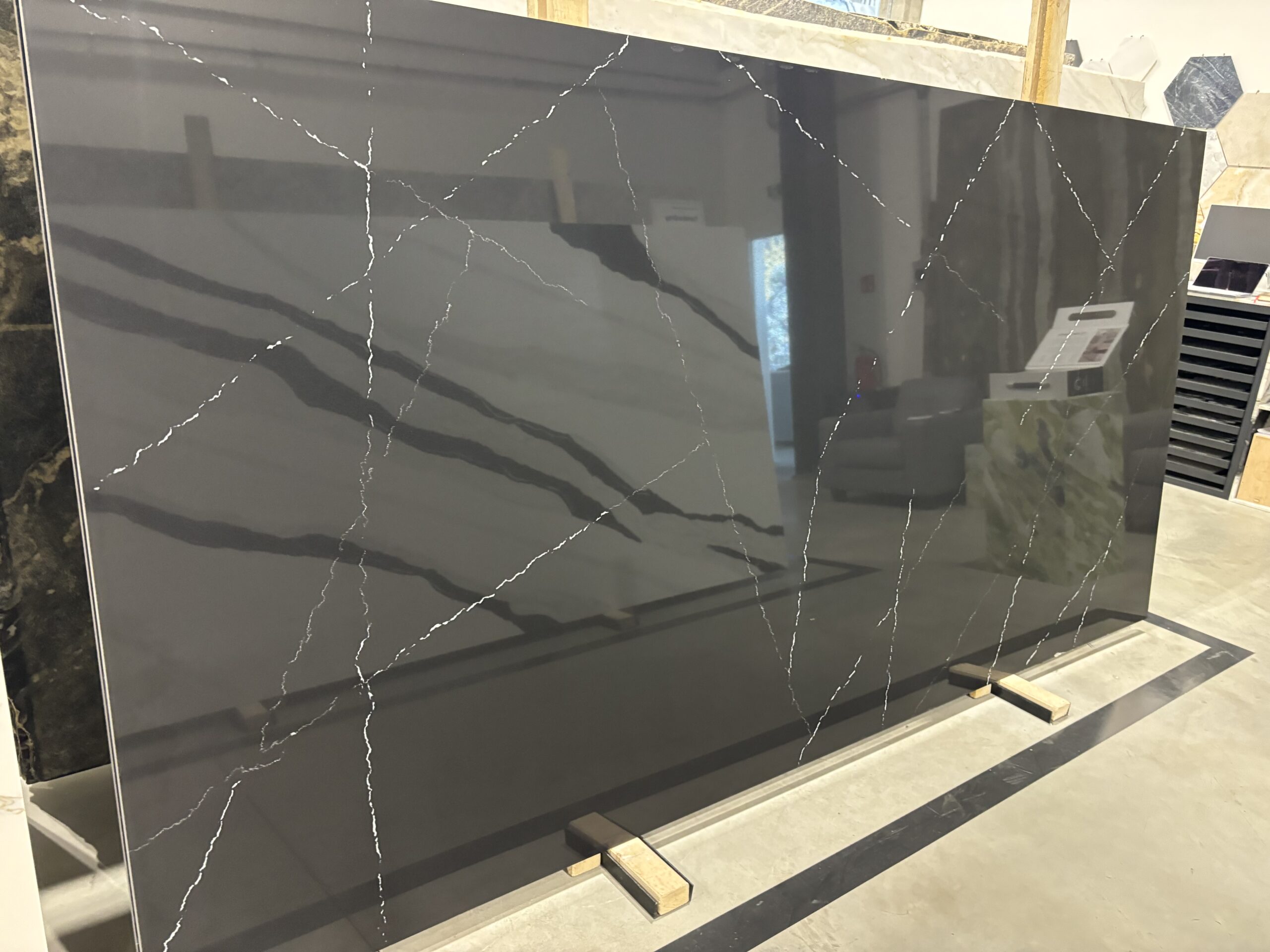 Výrazná deska Black Marquina z technického kamene s hluboce černým podkladem, který oživuje nepravidelné bílé žilkování v kontrastních liniích. Design působí dramaticky a elegantně zároveň – evokuje luxusní mramor Marquina a dodává interiéru moderní a sofistikovaný charakter.