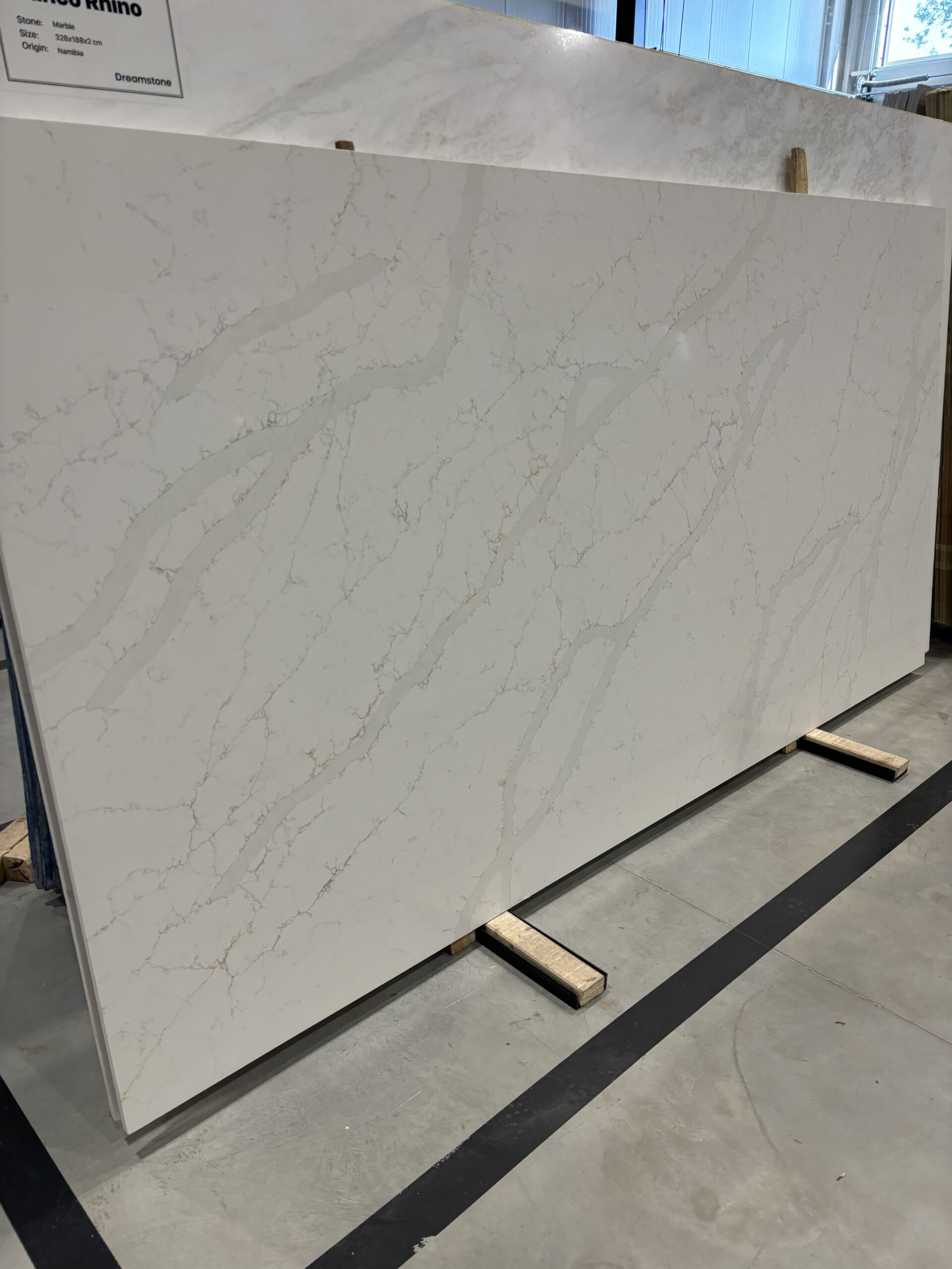Elegantní deska Calacatta Cremo z technického kamene s jemně bílým podkladem a decentním šedým až béžovým žilkováním, které působí přirozeně a harmonicky. Vzor připomíná jemnější variantu mramoru Calacatta – ideální pro interiéry, které chtějí působit luxusně, ale zároveň útulně a vyváženě.