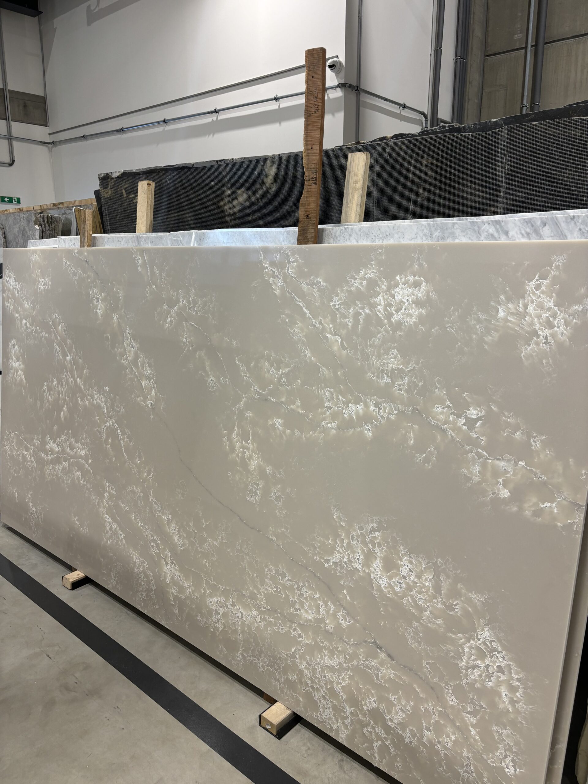 Moderní deska Opal Grey z technického kamene s elegantním šedým podkladem, jemně protkaným subtilním bílým a světle šedým žilkováním. Díky decentnímu vzoru působí vyváženě a univerzálně – ideální pro interiéry, které chtějí být moderní, nadčasové a snadno kombinovatelné s jinými materiály.
