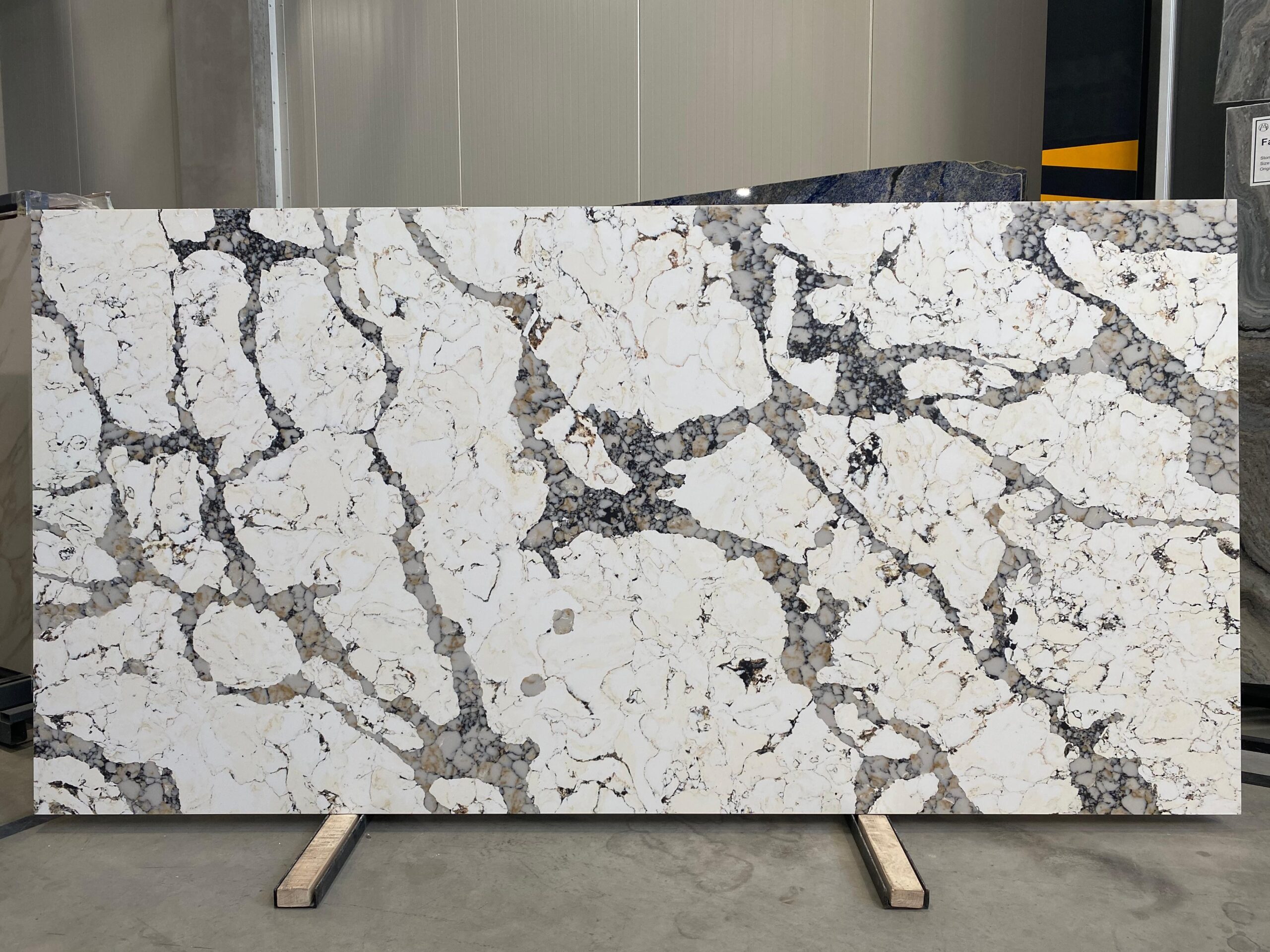Exkluzivní deska Patagonia z technického kamene s výraznou strukturou, která kombinuje bílý a krémový podklad s dynamickými šedými, zlatavými a černými žilkami i nepravidelnými plochami. Vzor působí jako přírodní krajina v kameni – dramatický, originální a okouzlující. Tento materiál se stává dominantním prvkem každého interiéru a dodává mu luxusní a umělecký charakter.